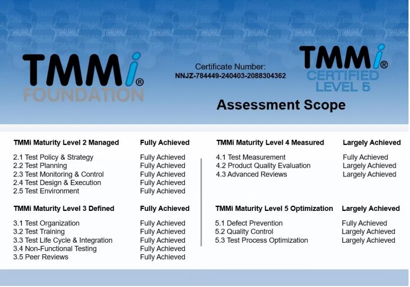 在本次TMMi5级认证过程中,神州信息咨询认证团队依据TMMi基金会推荐使用的IDEAL模型,进行了差距分析、体系优化建模、项目试点、预评估与正式评估等一系列改进和认证评估工作。TMMi咨询评估团队经过客观、认真细致而全面的评估,一致确认星空电竞融信在TMMi高成熟度方面表现出业界专业水平,完全符合TMMi5级的16个过程域标准。